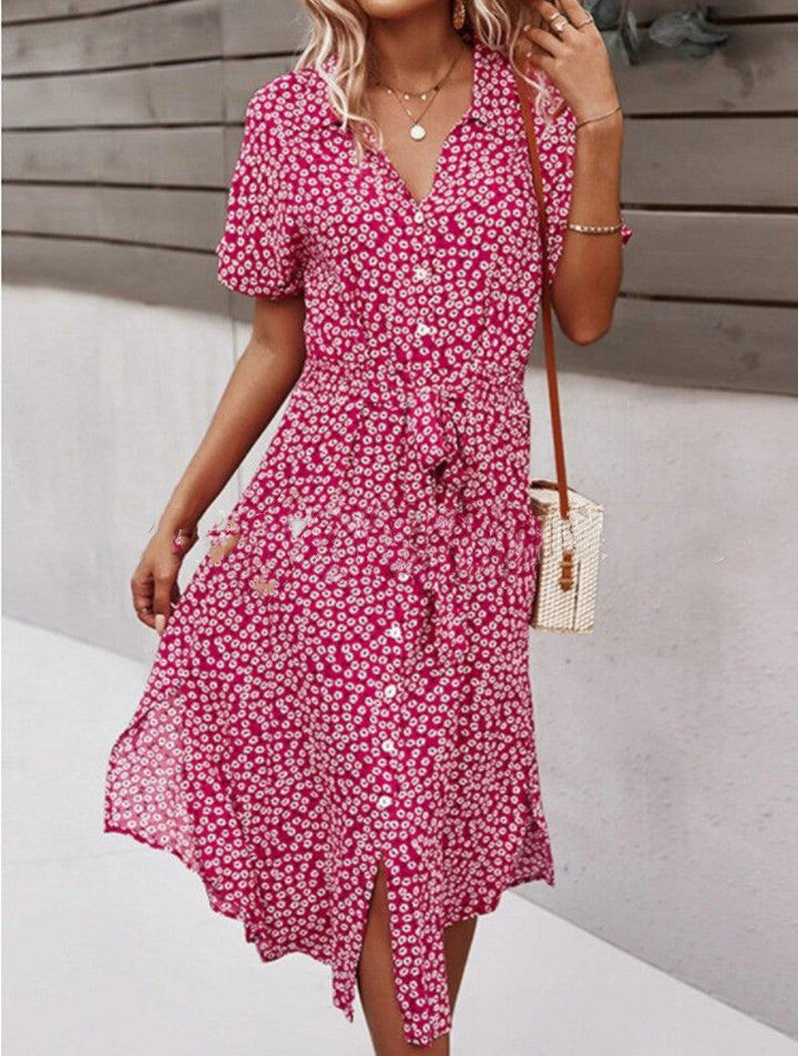 2021 New Floral Print Lapel Button Knotted Short Sleeve Dress
