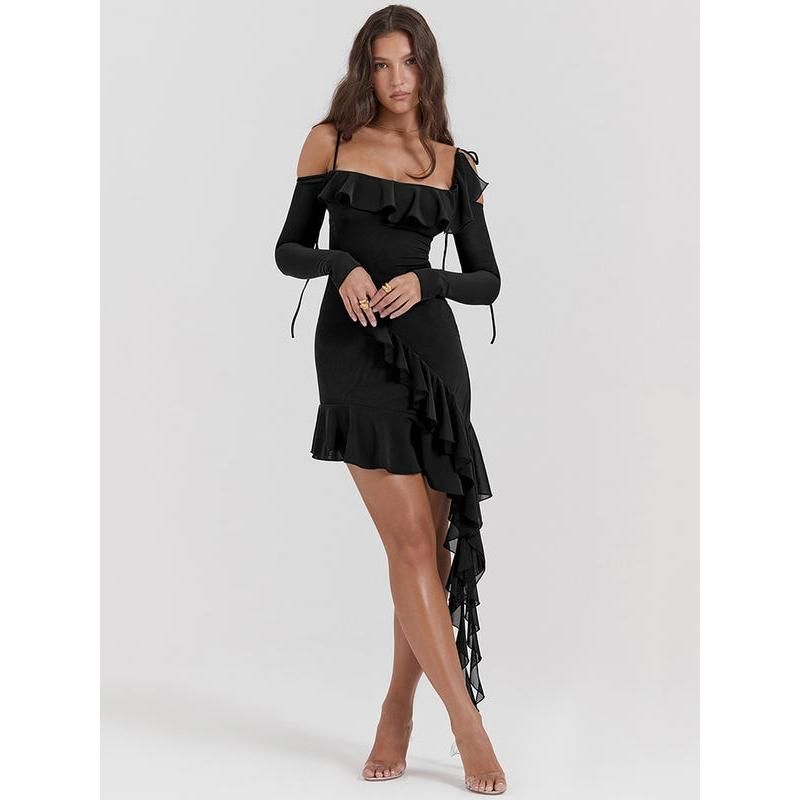 Our mini dress stands out with its unique slash neck and backless design, coupled with a charming ruffle detailing that adds a touch of sophistication. The full-length sleeves and above-knee cut create a balanced look that's both classy and daring. Crafted from a blend of high-quality polyester, spandex, and mesh, this dress offers a comfortable fit with medium stretch, ensuring you look and feel your best.
